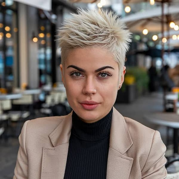 This bold cut pairs a fully shaved back with pronounced spikes on top for a dramatic, statement-making style. It’s ideal for women who want to express confidence and individuality. Minimal daily styling is required, as the strong contrast naturally draws attention and keeps the cut looking intentional and polished.
