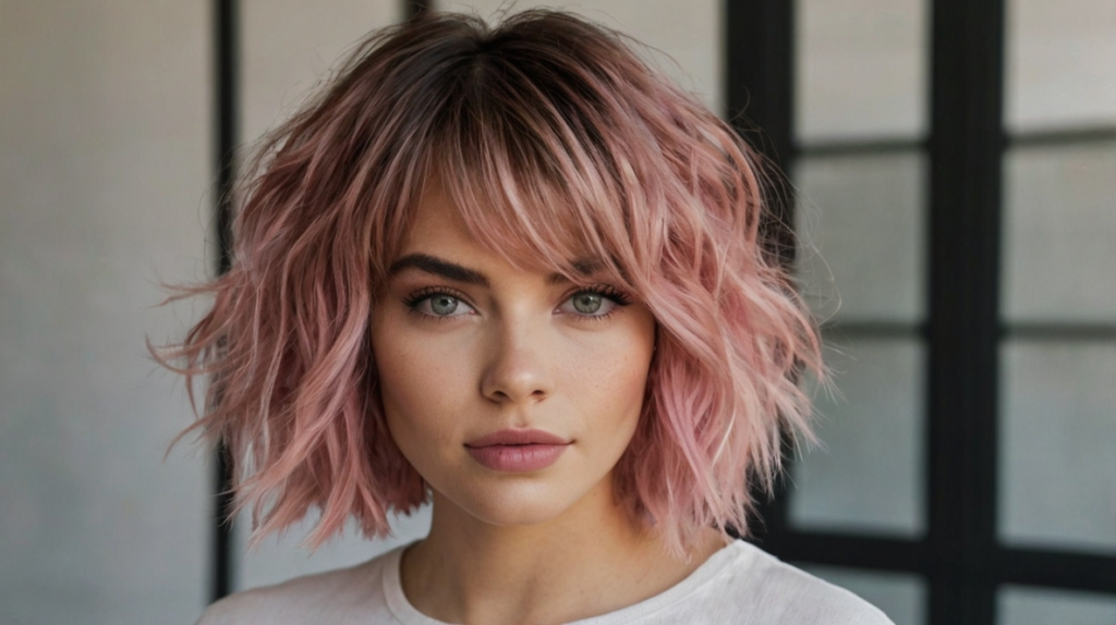 Adding a pinkish hue to a messy lob brings vibrancy and dimension to fine hair. The tousled texture adds thickness and movement, making strands look fuller. This playful, modern take on a classic lob is perfect for those wanting to showcase personality while maintaining a soft, voluminous style.
