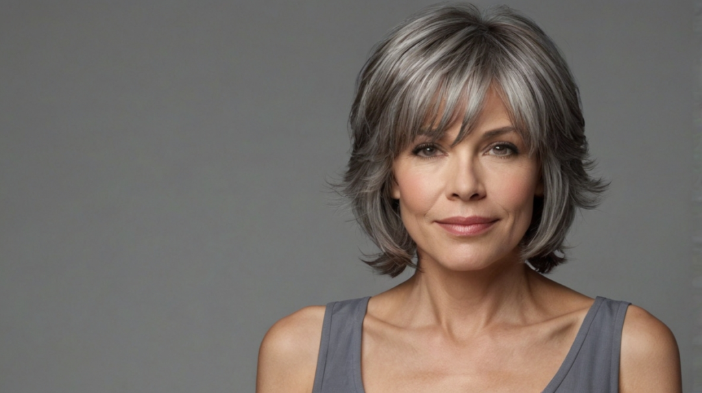 Gray hair is complemented beautifully by side bangs, which warm the face and add softness. The layers boost volume and prevent the hair from appearing flat, making it a chic, age-defying style that’s sophisticated and flattering.