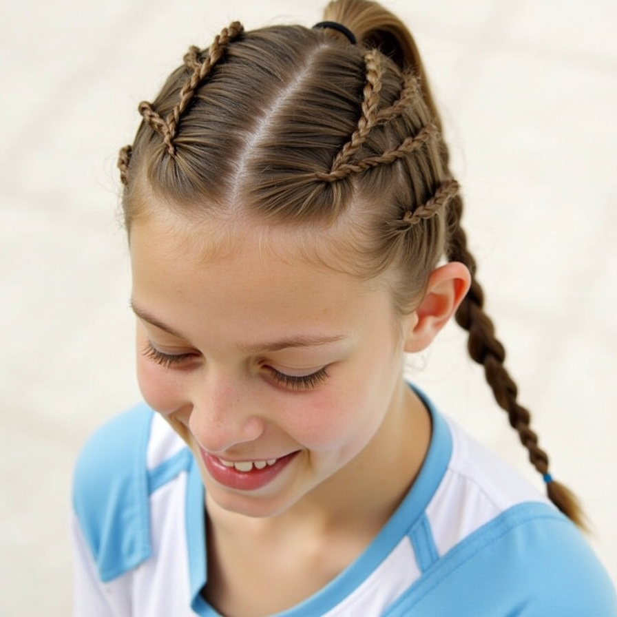 The team spirit braided style is designed to show off school or team pride while keeping hair contained. Hair is braided tightly, and colored ribbons or bands in team colors can be incorporated for a vibrant effect. The braids are functional, ensuring hair does not fall onto the face during practice or matches. This style is versatile, perfect for photos, games, or sports events, and can be adapted to different hair lengths. Proper combing and braiding prevent tangling and discomfort, while the decorative elements enhance the visual appeal. It’s a practical and spirited option for active young athletes.