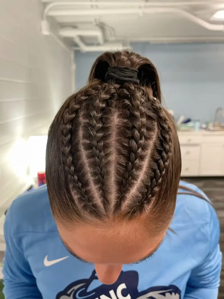 The cornrow braid bun is neat, stylish, and highly practical for active athletes. Small cornrows are braided close to the scalp and gathered into a tight bun at the top or back of the head. This design keeps hair completely contained, preventing it from loosening or becoming tangled during sports activities. The hairstyle looks professional and organized while remaining comfortable for long hours of play. It works well with helmets, hats, or headbands. The combination of cornrows and a bun offers maximum control, making it an ideal option for girls who prioritize neatness, durability, and style during high-intensity games or training.