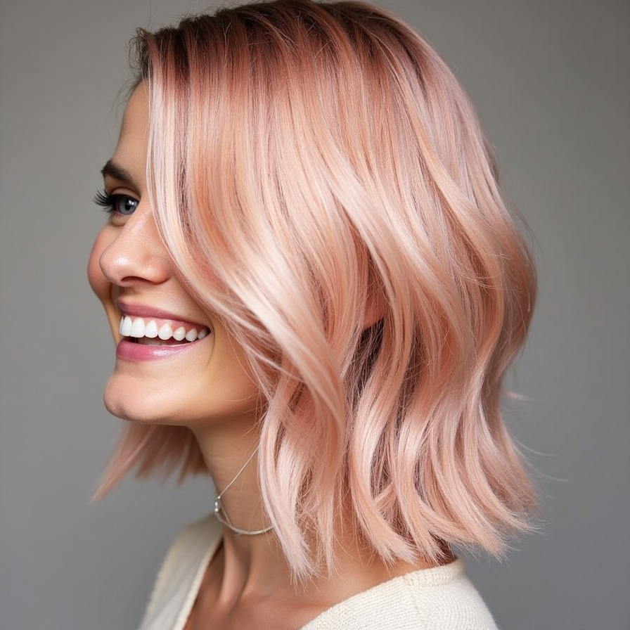 Rose gold blonde combines warm blonde bases with copper-pink undertones, offering a vibrant yet elegant metallic finish. This trend-forward shade is created on a level 8–9 blonde base with rose-tinted glosses, delivering a luminous, dimensional effect. Rose gold highlights complement textured or wavy hairstyles, especially beachy waves or soft curls, capturing light beautifully for a polished, radiant appearance. Maintaining this delicate shade requires sulfate-free shampoos and weekly color-depositing treatments to prevent fading. Regular touch-ups every 6–8 weeks preserve its vibrancy, making rose gold blonde a chic choice for those seeking trendy elegance with a soft, feminine edge.