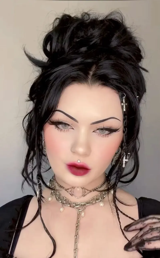 The sleek Gothic bun is a refined and polished hairstyle that exudes dark elegance. Hair is gathered into a smooth, high bun, with a clean, glossy finish emphasizing the style’s sophistication. The minimalist yet dramatic design complements Gothic makeup and attire beautifully. This hairstyle works well for formal events or costume occasions, highlighting the wearer’s facial features and offering a mysterious, vampiric charm. Its simplicity ensures versatility, while the sleek lines and structured form provide a modern, haunting aesthetic perfect for any Gothic-inspired ensemble.
