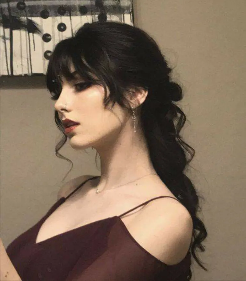 This hairstyle combines deep, dark hues with soft, cascading waves, creating a mysterious aura ideal for those drawn to Gothic and vampire-inspired looks. A sharp fringe frames the face perfectly, adding an edgy yet sophisticated touch. The blend of romantic waves and precise bangs ensures a dramatic and elegant style suitable for themed events or cosplay. Its allure lies in the balance between softness and intensity, making it a versatile choice for anyone looking to enhance a dark, hauntingly beautiful appearance while keeping it stylishly refined.