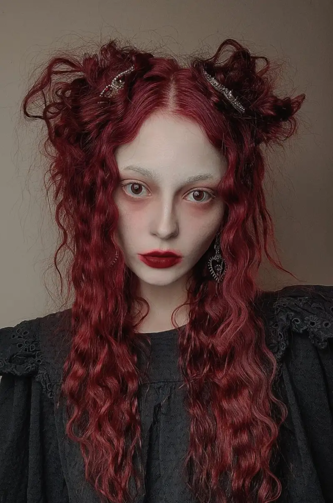 Crimson braided pigtails deliver a daring and playful Gothic vibe. Twisted braids, often combined with loose waves, create a dynamic look that captures attention immediately. This bold style is perfect for expressing creativity and a touch of mischievous charm, blending elements of fantasy with dark elegance. The vibrant crimson tone amplifies the dramatic effect, making it an ideal choice for those who want to embrace a powerful, theatrical vampire-inspired appearance. Its combination of color, texture, and structure ensures a striking and memorable style.