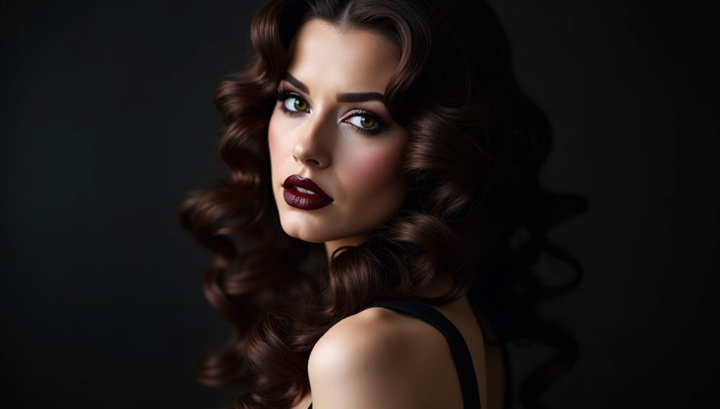 Long, flowing waves in deep, dark shades create a luxurious and timeless vampire-inspired look. Hair is styled to one side, creating natural volume and movement while emphasizing shine and texture. This hairstyle radiates sophistication and grace, complementing Gothic or formal outfits beautifully. Its effortless elegance makes it suitable for evening events, costume parties, or themed gatherings. The smooth waves balance mystery with classic appeal, delivering a polished look that communicates both refinement and the understated drama of traditional vampire aesthetics.