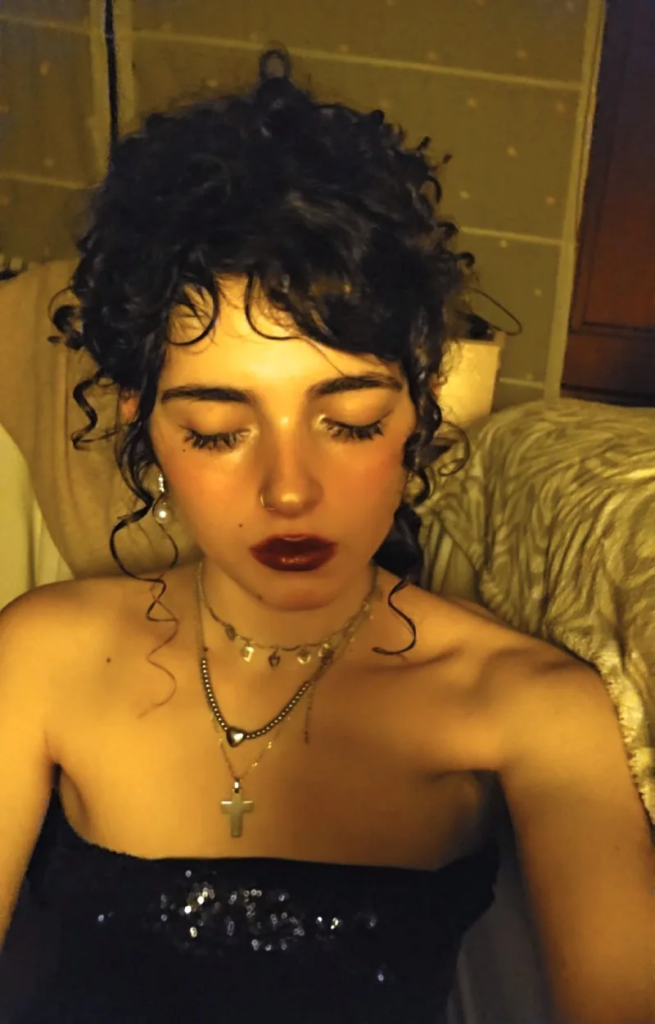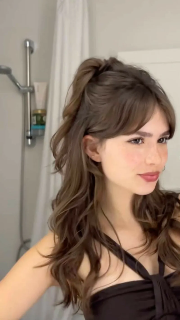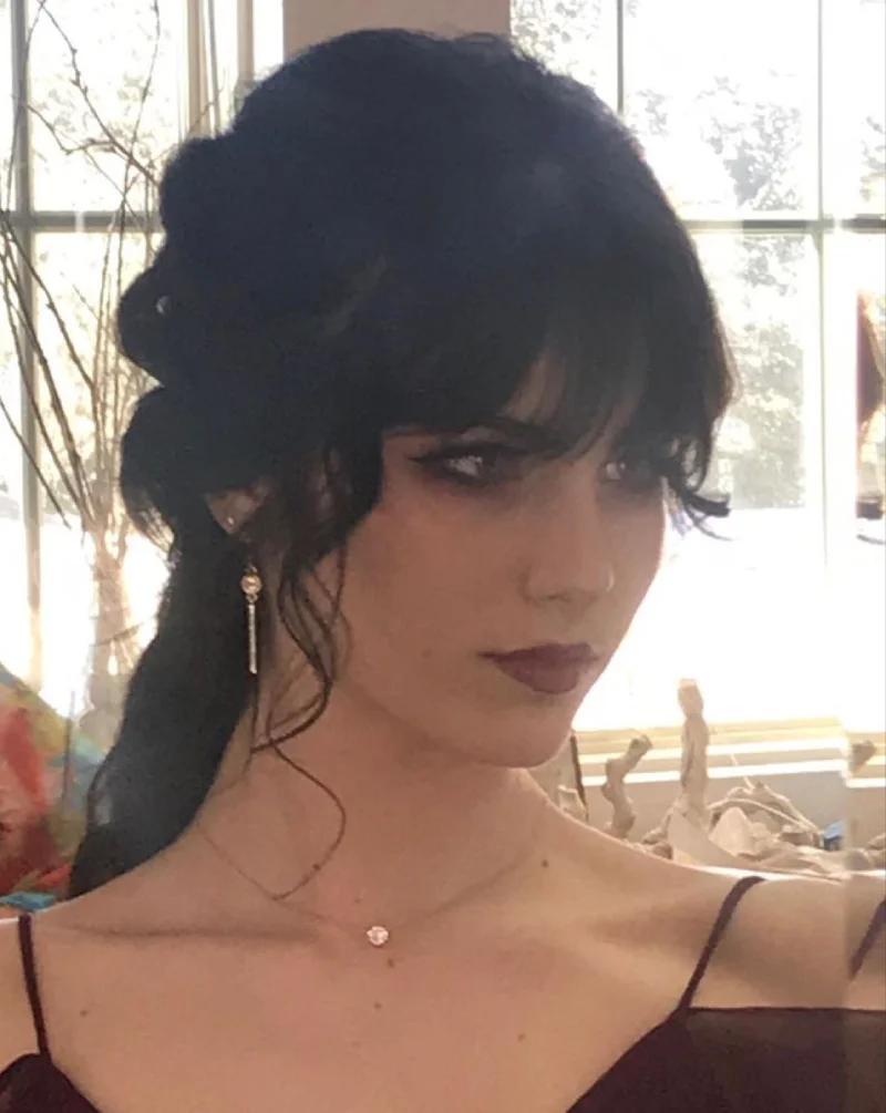 A soft vampire ponytail is high and voluminous, with loose waves cascading gracefully down the back. The style conveys both playfulness and elegance, making it suitable for casual Gothic fashion or themed occasions. Its relaxed waves add texture and movement, while the height and fullness of the ponytail create a striking silhouette. This hairstyle is perfect for anyone seeking a vampire-inspired look that combines charm, sophistication, and Gothic flair. It highlights the wearer’s personality while maintaining a subtle, dramatic aesthetic appropriate for both day and night events.
