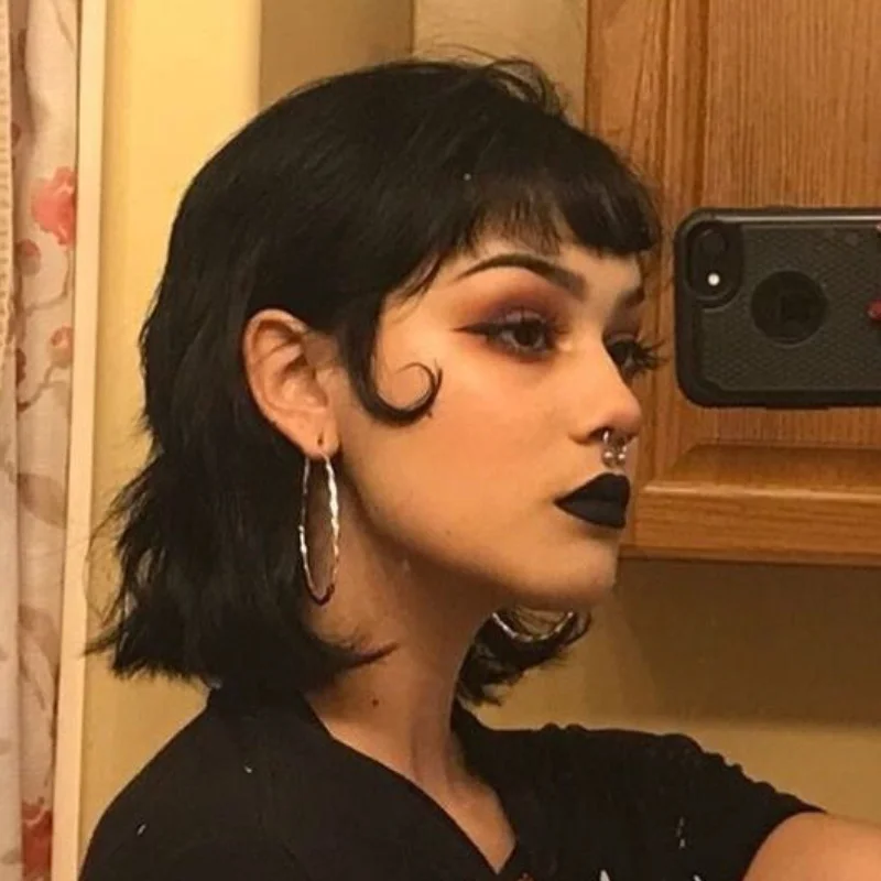 The curly Gothic crop provides a short, edgy alternative to traditional long vampire hairstyles. Tight curls add volume and texture, enhancing the hairstyle’s boldness. This cropped style conveys confidence and modernity while maintaining a Gothic sensibility. Perfect for individuals seeking a less conventional vampire-inspired look, the curly crop balances youthful energy with dark sophistication. Its daring length and texture allow for versatility, making it suitable for both casual Gothic fashion and formal themed events. The overall impression is edgy, stylish, and powerfully expressive.