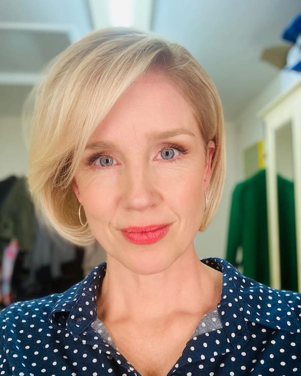 This short blonde haircut with a well-toned fringe offers a radiant and structured style. The fringe frames the face while the short length keeps it manageable. It’s ideal for women looking for a bold yet easy-to-style haircut suitable for both everyday wear and special occasions.