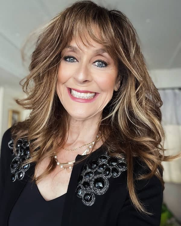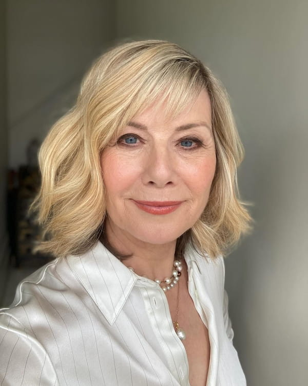 Long wavy hair with bangs is an excellent choice for women who want a versatile wash-and-wear hairstyle. The waves give the hair movement and volume, while the bangs frame the face delicately. This style allows mature women to maintain length without sacrificing manageability, offering a stylish and elegant look that works for both casual and formal occasions.