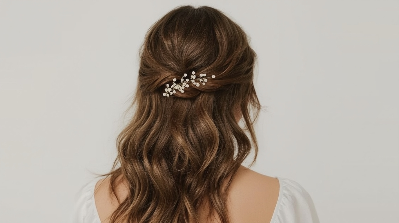 This hairstyle also allows for personalization. Braids, twists, or small decorative pins can be integrated into the ponytail section for a unique flair. It suits most hair types, whether thick, thin, straight, or curly, and can be adapted to match the formality of the wedding. The half-up ponytail is especially practical for outdoor weddings, as it keeps hair away from the face while still maintaining an elegant, flowing look.