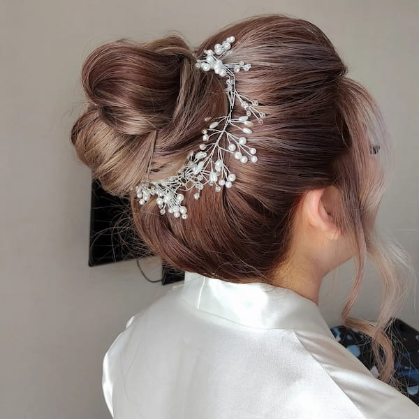 A messy loose bun provides a soft, effortless charm. Its undone structure allows for a natural appearance, while subtle highlights or low-key styling elevate the look for a wedding. This hairstyle is perfect for women who prefer understated elegance without the use of multiple pins or accessories.