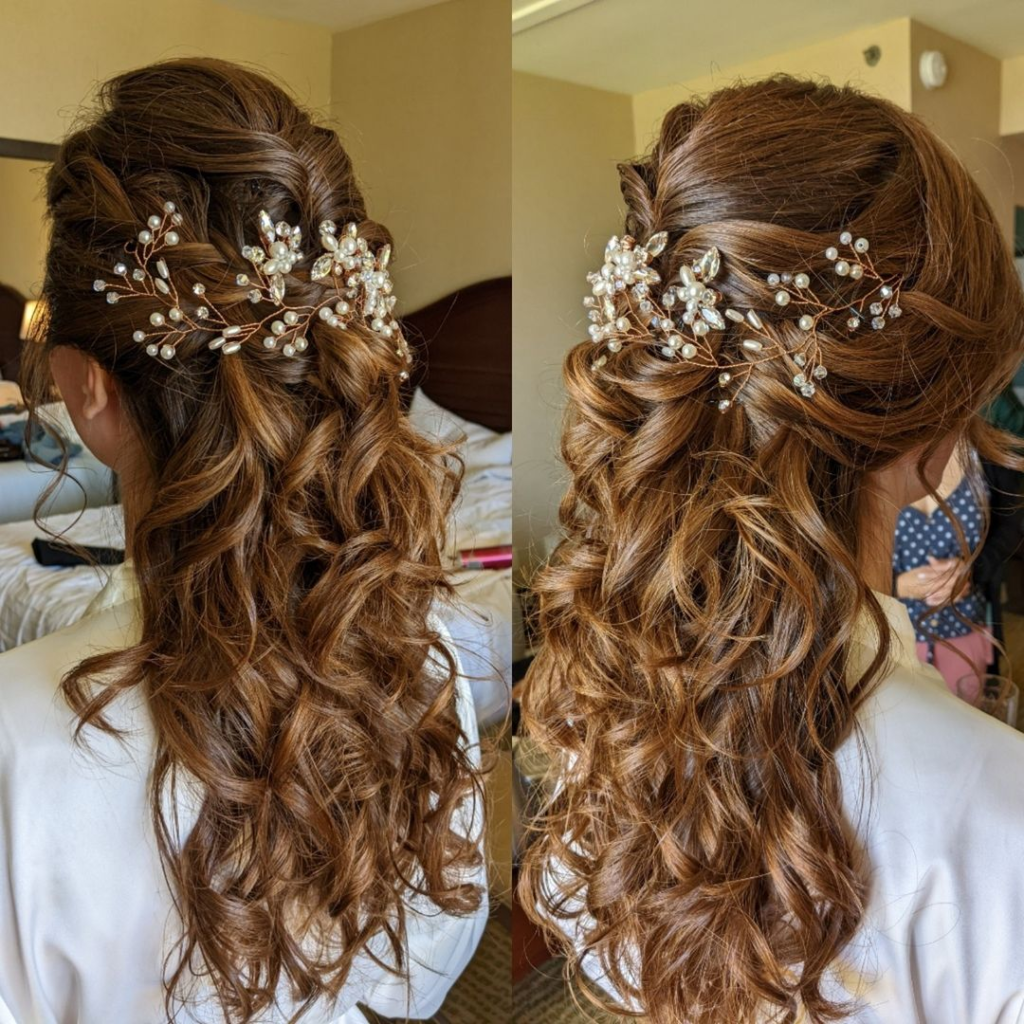 Half-up styles with cascading curls are ideal for long-haired brides. The curls provide movement and fullness, while decorative pins accentuate the style without overpowering it. This combination works beautifully for formal ceremonies, ensuring a balanced and captivating look.