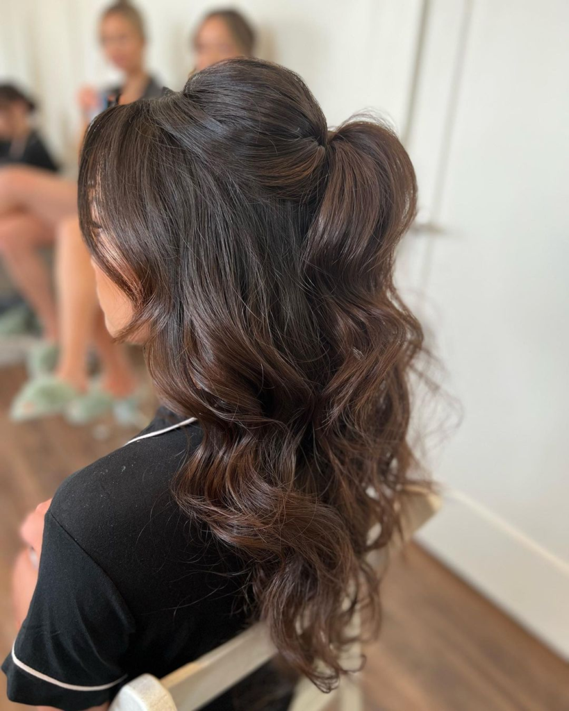 A quick half-up half-down style in brunette hair offers simplicity and charm. Minimal accessories keep the focus on the hair’s natural texture and movement, making it perfect for guests or brides seeking a low-maintenance yet beautiful style.