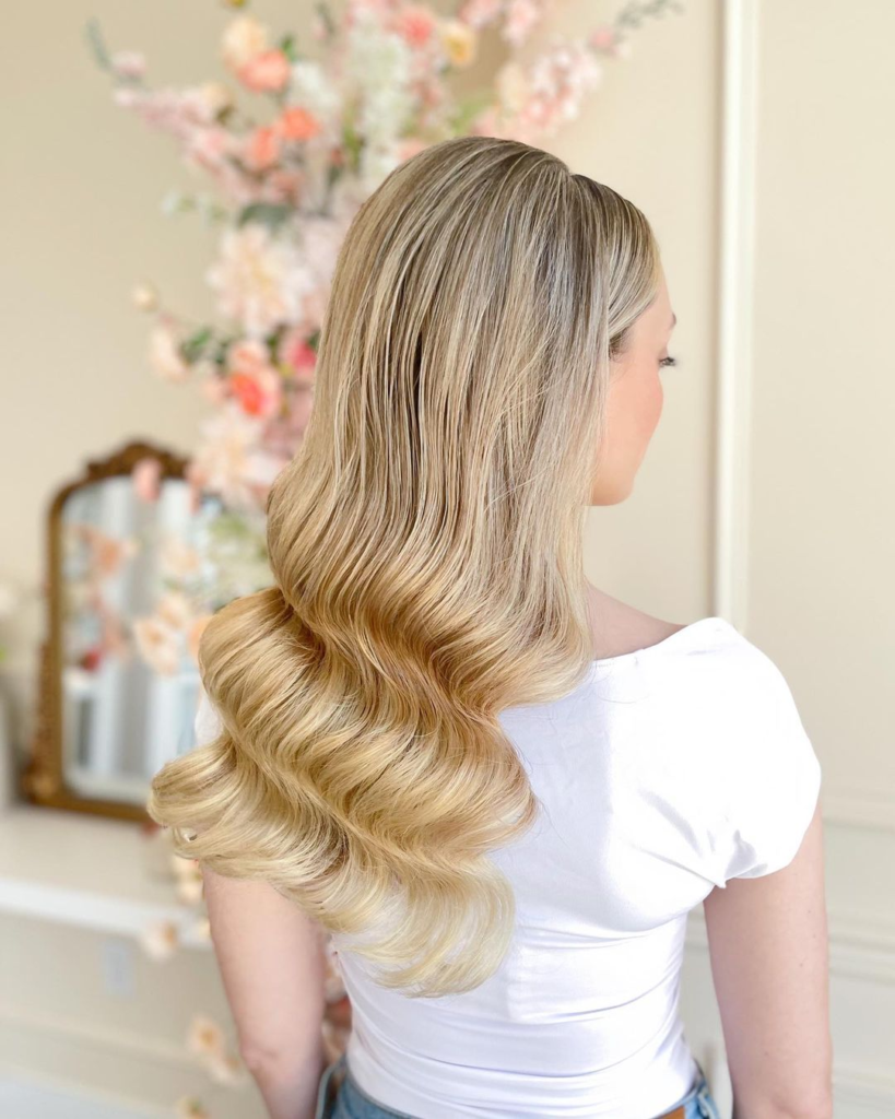 Stepped waves in smooth blonde hair create a romantic, polished look. The wave layers provide dimension, while the blonde hue enhances shine and brightness. This hairstyle is elegant and understated, ideal for weddings that favor simplicity with impact.