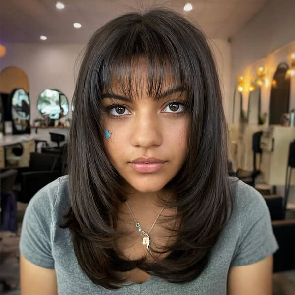 Layered mid-length hair with wispy bangs is a practical yet stylish option for daily wear. The layers add movement and volume, while the bangs soften facial features and create a balanced silhouette.