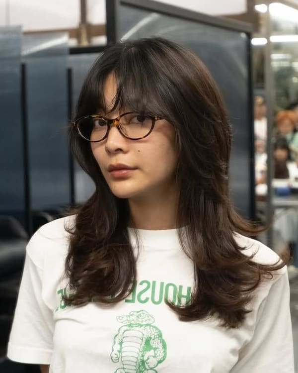 Long layered hair with wispy bangs pairs beautifully with glasses, offering balance and softness around the face. The bangs help soften the forehead area while directing attention toward the eyes.