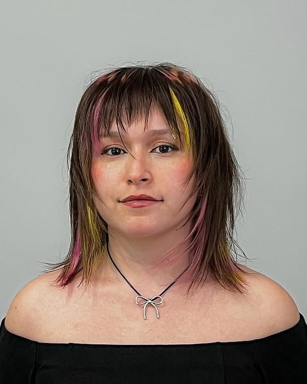 A multi-coloured edgy haircut with wispy bangs is bold, expressive, and full of personality. The combination of vibrant tones with soft bangs creates contrast while keeping the look wearable.