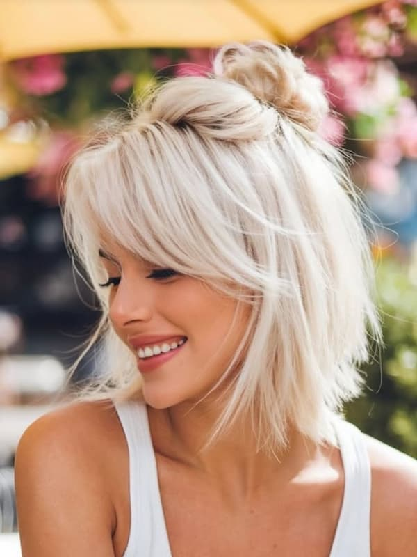 A layered bob styled with a half bun and wispy fringe delivers instant elegance. The half-up style adds volume, while loose layers maintain softness and movement.