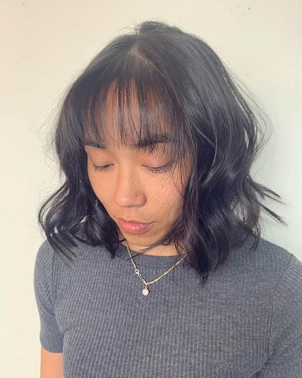 Shoulder-length wavy hair paired with wispy bangs offers effortless charm and versatility. The waves create natural texture, while the bangs add balance and softness around the face.