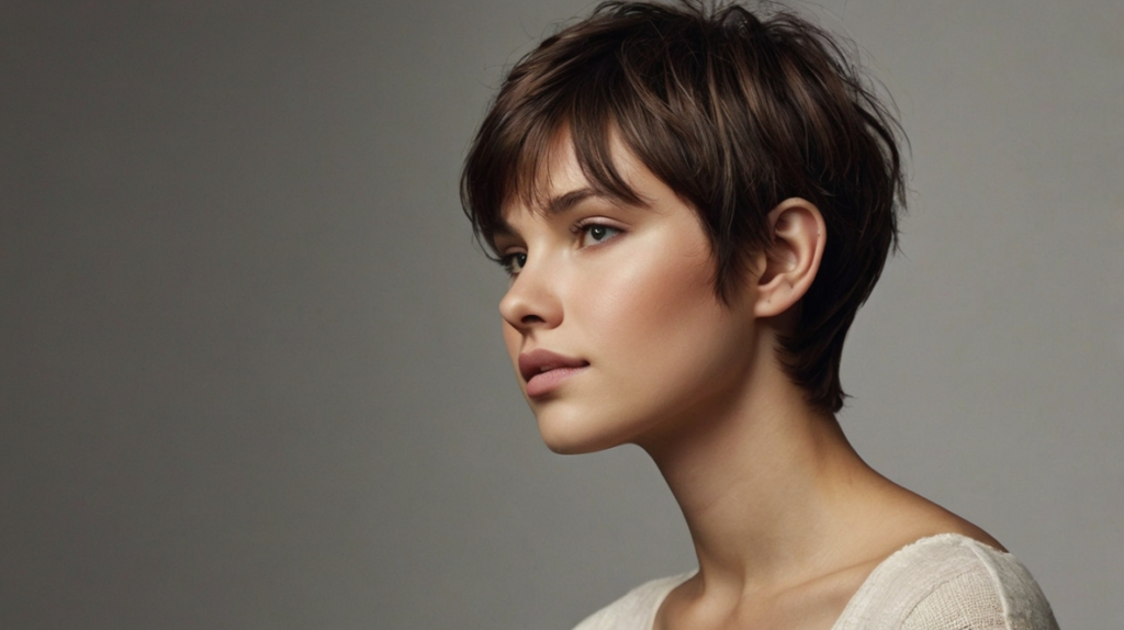 Minimal styling is required—just a bit of texturizing product to enhance layers. The bangs soften the pixie shape, creating balance and approachability.