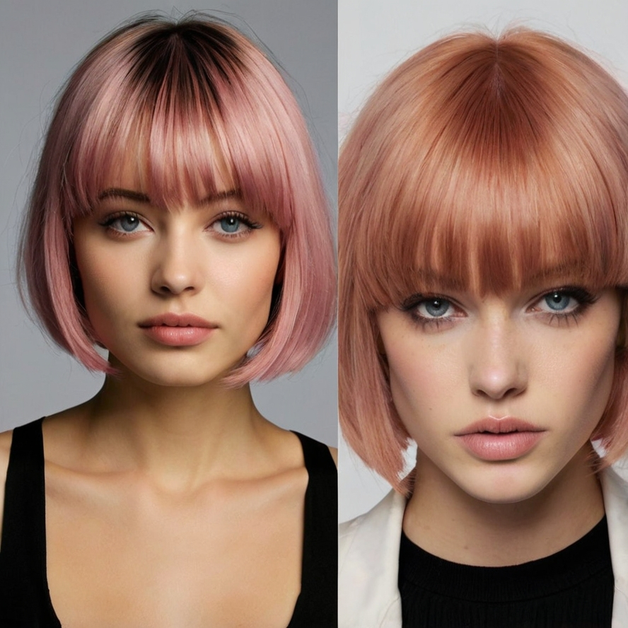 A pinkish long bob with wispy bangs combines soft femininity with creative flair. The pastel tone adds freshness, while the airy bangs keep the look light and elegant.